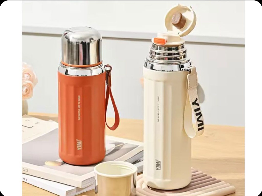 فلاسک استیل حجم ۶۳۰ میلی لیتر بدنه‌ شیار دار به همراه بند دستی